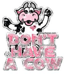 Dont have a cow เป็นประโยคที่ไม่สุภาพ และ ไม่ควรใช้. ถ้าคุณต้องการบอกให้ใครใจเย็นๆ, ควรพูดว่า Please be calm, please dont be mad, please keep your head, please stay calm, please keep your cool, etc. โกรธไป, กังวลมากไป, เครียดจัด ฯลฯ ไม่ทำให้อะไรดีขึ้น; ฉนั้น, โปรดหัดปล่อยวาง เพราะใจที่ว่างจะเป็นหนทางสู่ปัญญา.